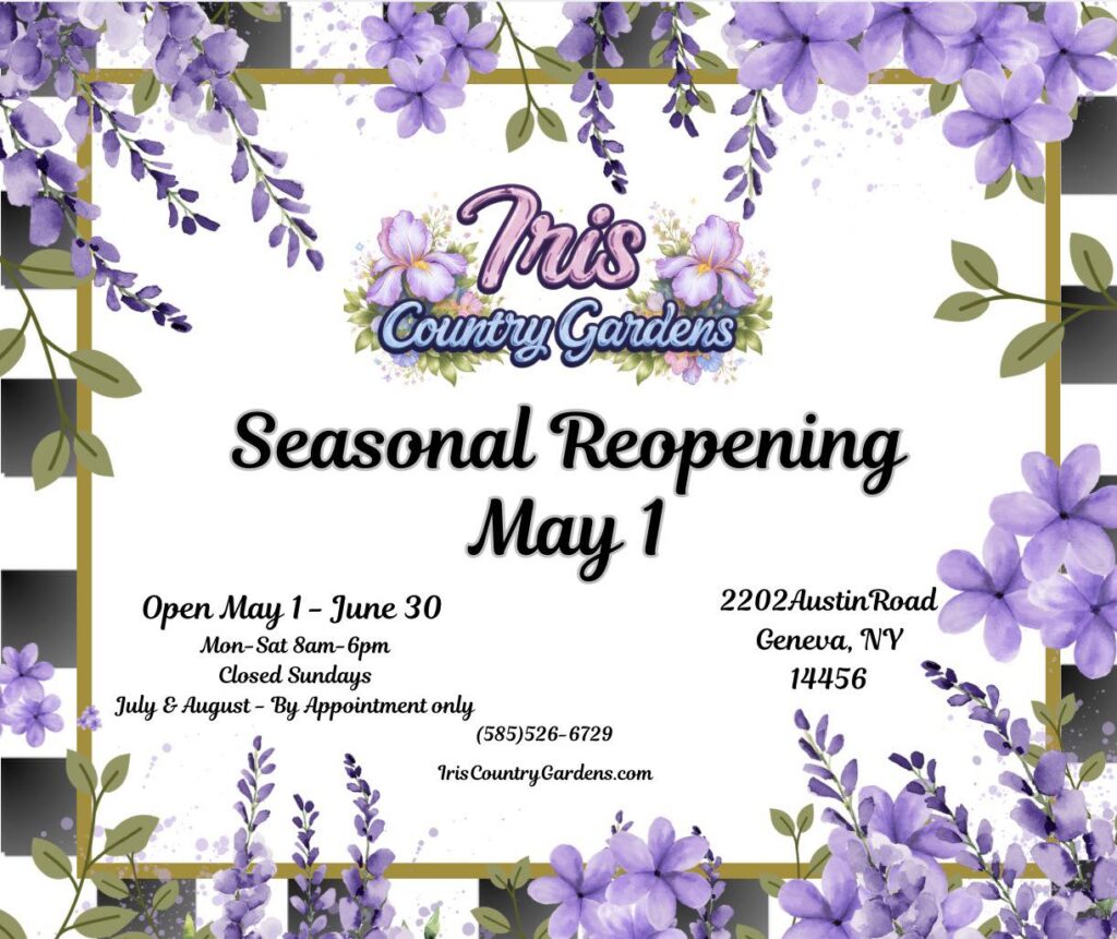 Iris Country Gardens is a 6+ acre garden located in Geneva, NY of the Finger Lakes region. We specialize in iris plants, daylilies, peonies and hosta. We also sell many other perennial plant varieties. We are now open Monday – Saturday am to 6 pm, closed on Sundays. We are a seasonal business. Open April through end of July and by appointment only for August & September and closed for the remainder of the year. Please call us if you are looking for a special plant variety.